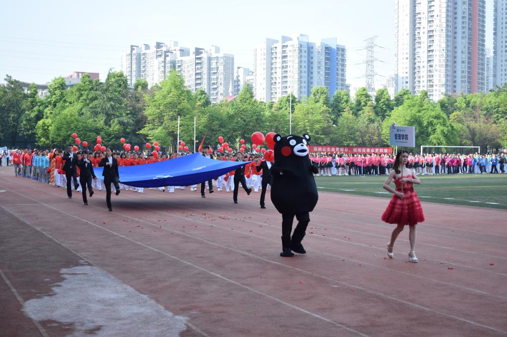 开幕式正式开始,一支支庞大的方阵随着音乐的节奏,踏步入场。无论是领头的国旗班、彩旗队,还是各个学院的方阵,都英姿勃发,昂首阔步,展现着自己的活力与激情。管理学院师生代表队迈着整齐的步伐走过主席台时,不仅有现在最热门的人偶熊本熊相伴,更有一齐放飞的红色气球,在湛蓝的天空下整个南操的景象显得明媚温暖。随之而来的便是各学院训练已久的体操比赛,整齐划一的动作让观众们心中升起温暖与青春的期盼。