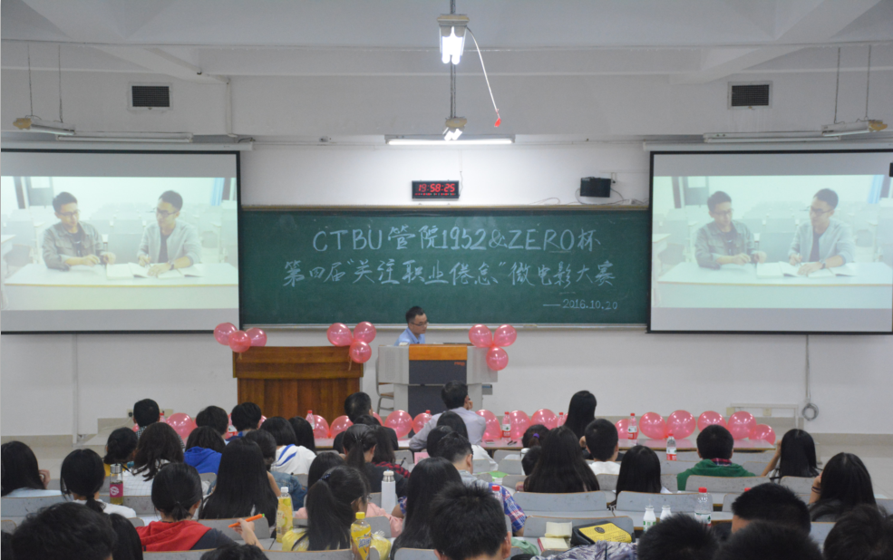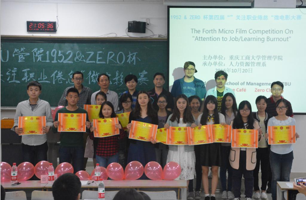由管理学院人力资源管理系主办的“1952&ZERO杯”第四届“关注职业倦怠”微电影大赛于2016年10月20日19:00在南岸校区07321教室成功举办。本次大赛共有34部微电影作品围绕这一主题进行创作,其中有12部作品入围决赛进行现场展播。