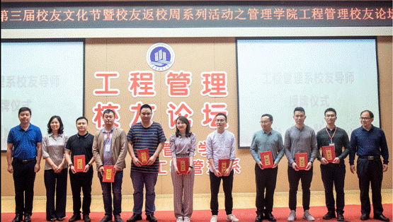 本次共授牌校企合作实习实践基地五家,为工程管理专业学子搭建了良好的社会实践平台;同时现场颁发了由重庆瑞达资产评估房地产土地估价有限公司设立的企业奖学金,瑞达奖学金设立9年,共计资助工程管理优秀员工54名;为充分发挥教师育人主导作用,营造全员育人氛围,有效推动思想教育与专业教育、课堂教育与课外教育相结合,促进员工全面发展。管理学院特成立工程管理员工导师计划,邀请工程管理系优秀员工担任专业导师,搭建员工与学院沟通平台,指导在校员工成长和职业发展。第一期导师计划共授予10名员工导师,他们分别是:03级员工、财信发展投资发展中心总经理马荷,04级员工、中垭建设集团项目经理王涛,05级员工、云南龙镁环境科技有限公司金小龙,05级员工、金科地产集团副总监吴边,05级员工、重庆时刻房地产顾问有限公司创始人赵明,06级员工、重庆市建设项目管理有限公司咨询事业部技术负责人任智勇,08级员工、重庆市城市建设管理学校BIM中心负责人张增全,10级员工、碧桂园川西南区域总裁助理文强,10级员工、重庆坤源衡泰律师事务所专职律师王露,11级员工、广联达教育培训事业部东南大区服务经理林俊杰。