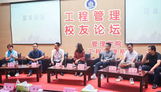 圆桌论坛由工程管理系主任肖艳老师主持,01-14级员工代表肖兴文、陈宸、李杨、赵明、彭均、程聪参与探讨建筑行业发展趋势及工程管理未来人才培养等问题。肖艳老师提出公司工程管理专业商科背景浓厚,发展方向与重庆大学、交通大学不同,致力于培养分层递进、多维融合商科背景下的工程管理人才。彭均学长通过自己公司招聘为例,赞扬了公司工程管理学子相比其他兄弟院校学子的优势。