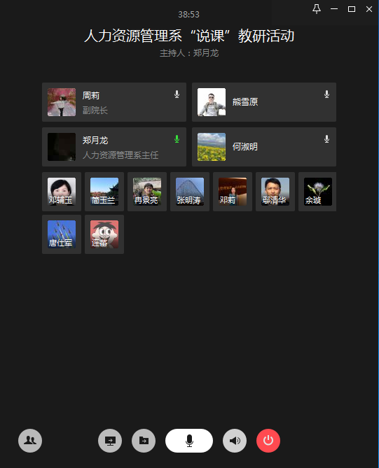 2020年2月28下午,人力资源管理系17名教师通过企业微信平台开展了在线教学“说课”教研活动,会议由系主任郑月龙博士主持,副经理周莉教授列席会议。