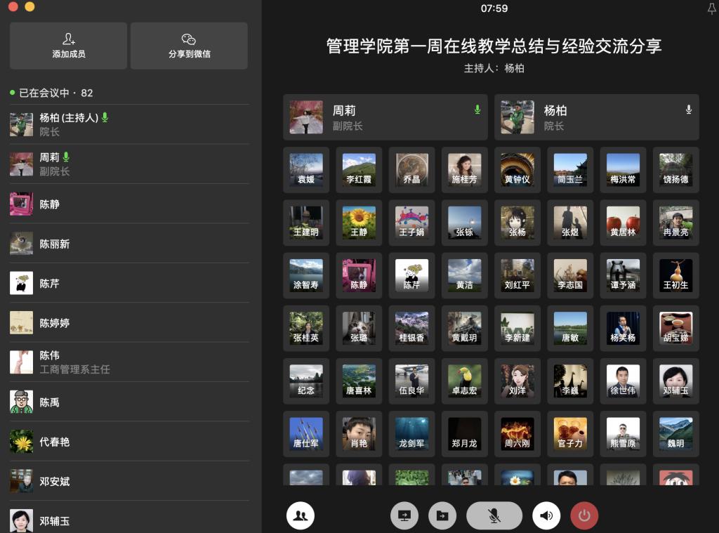 为及时发现教师在线教学中的问题,总结和交流在线教学心得、成功经验或典型做法,了解员工对教师在线教学的意见或建议,确保在线教学工作顺利开展,管理学院于3月6日下午14:00在企业微信平台召开在线开学第一周教学总结与经验交流分享会,杨柏经理主持会议,学院全体教职员工参加了会议。
