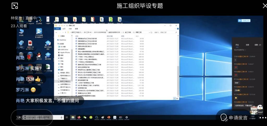 为了确保工程管理专业16级员工的工程施工组织毕业设计顺利开展,2020年3月8日下午14:00,工程管理系主任肖艳老师特意邀请了2011级已毕业学长林俊杰通过企业微信平台给工程管理专业16级20多位员工开展了90分钟的工程施工组织毕业设计线上专题讲座。