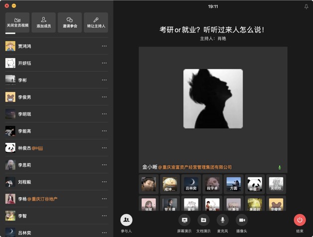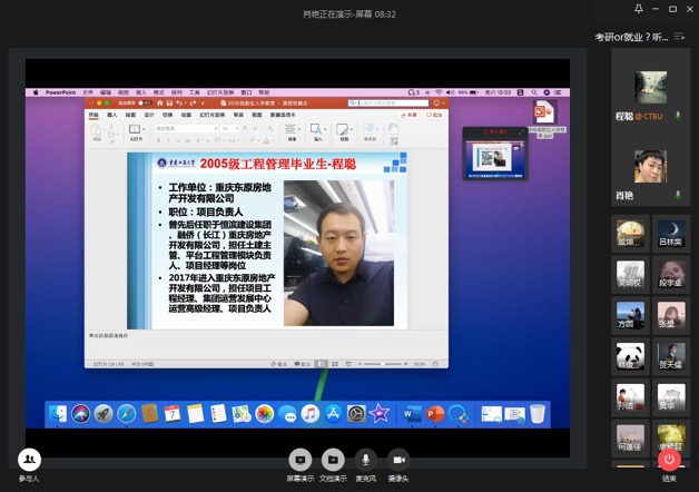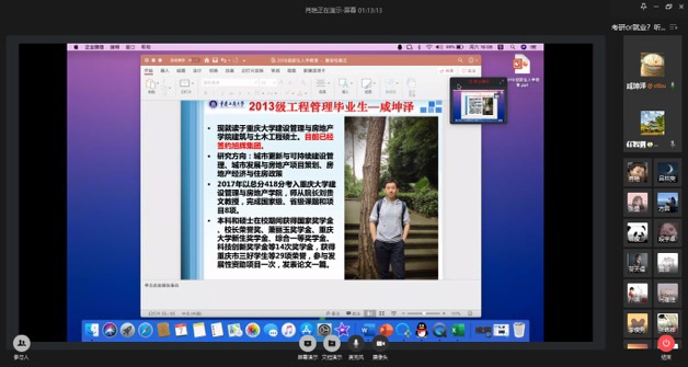 2020年3月7日下午15:00,管理学院工程管理专业召开题为“考研or就业?”的在线网络讨论会议。本次会议由工程管理系主任肖艳老师主持,17级工程管理专业全体同学以及部分18级员工代表参加了本次会议,会议还邀请到程聪、林俊杰、谷威洋、金小晰、咸坤泽、张增全、文强、李杨、任智勇、陶步天共10位员工导师参会。