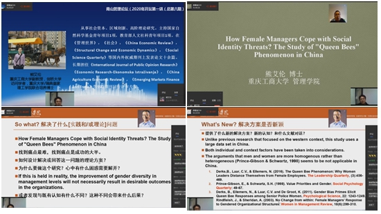 随后管理学院人力资源管理系熊艾伦博士报告了其国家自然科学基金青年项目中一项题为《How Female Managers Cope with Social Identity Threats? The Study of "Queen Bees" Phenomenon in China》的阶段性研究成果,贾良定教授结合如何做好一流管理研究的几个维度,从研究题目、研究假设、数据收集及逻辑思路对熊艾伦博士论文进行了精彩点评,为后续改进完善提出了具体建议。