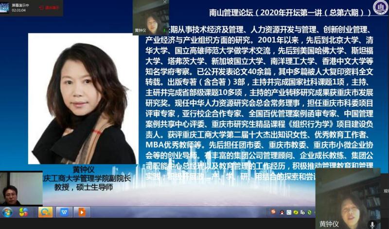 最后,管理学院副经理黄钟仪教授做了总结发言。她首先表达了对贾良定教授衷心感谢,表达了对贾教授做负责任、有情怀的一流研究管理学研究的敬意;其次,针对熊艾伦博士的学术论文,建议加强与既有文献与理论的对话加以改进;最后,通报了下一期南山管理论坛的主题是“新冠疫情相关的管理学思考”,欢迎大家持续关注南山管理论坛。