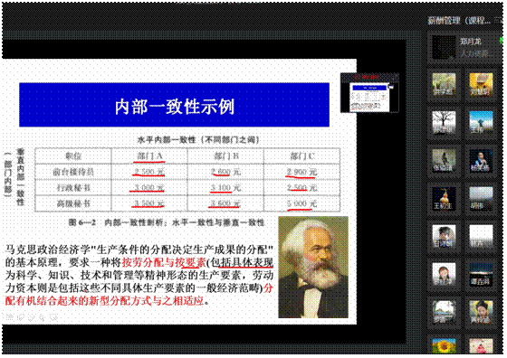 接着,郑月龙老师开展本次教学内容——薪酬结构设计,包括薪酬结构确定的流程和薪酬结构的内涵及关键性指标两个知识点。郑老师精心设计教学环节,采用多种教学方法,充分调动了员工学习的积极性、主动性。在教学中,郑老师首先回顾了与本次课内容相关的前续课程知识,薪酬体系设计基础和薪酬水平及外部竞争性;接着,对薪酬结构确定中的重点知识点内部一致性和外部竞争性,通过数据分析进行形象风趣的讲解,并结合马克思主义政治经济学,简单阐述了我国作为社会主义国家按劳分配与按要素分配有机结合的客观性。据此,郑老师着重指出以按劳分配和按要素分配为指导,具体到组织管理中就体现为按贡献分配,这是薪酬结构设计保证内部一致性的重要理论遵循;进一步地,郑老师在讲述薪酬结构关键性指标,如薪酬区间变动率、薪酬比较比率等,强调按贡献分配在其中的贯彻和体现,并结合习近平总书记2018年新年贺词“幸福都是奋斗出来的”、2019年9月1日开学第一课“立鸿鹄志,做奋斗者”的思想内涵,从人力资源管理学科知识融合的视角,借助《管理学》、《积极心理学》、《劳动经济学》等课程内容,指出薪酬结构设计作为一项管理活动,应该能够营造一种良好的氛围,让员工能够在这种氛围下“幸福的奋斗”,这是管理者的责任和使命,也是贯彻习总书记谆谆教诲的体现;郑老师在讲到知识点“同一组织相邻两个薪酬等级之间的交叉与重叠关系”时,针对知识点“在实践中,大多数情况下,企业倾向于将薪酬结构设计成有交叉重叠的,尤其是中层以下的职位”,与员工进行了“问-答-分析”式的互动,如线下教学那样自如。整节课下来,郑老师的课堂知识点突出、讲解通俗易懂、思政与专业知识融合到位、课堂活跃,保证了线上与线下教学质量和教学效果的同质。