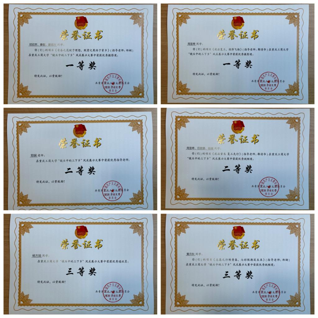 作品“青春之花绽于理想,脱贫之果结于家乡”和“疫后复工,经济飞扬”荣获优秀摄影一等奖;作品“扶贫攻坚发展产业,精准到户引领脱贫”和“决胜重庆14个贫困县脱贫攻坚”获优秀报道三等奖;作品“疫后重生,复工先行”获优秀视频二等奖,作品“志愿之行燃青春,七彩假期筑未来”获优秀视频三等奖。同时,郑娴老师获优秀指导老师,2019级工商一班杨方娟同学获优秀通讯员荣誉称号。