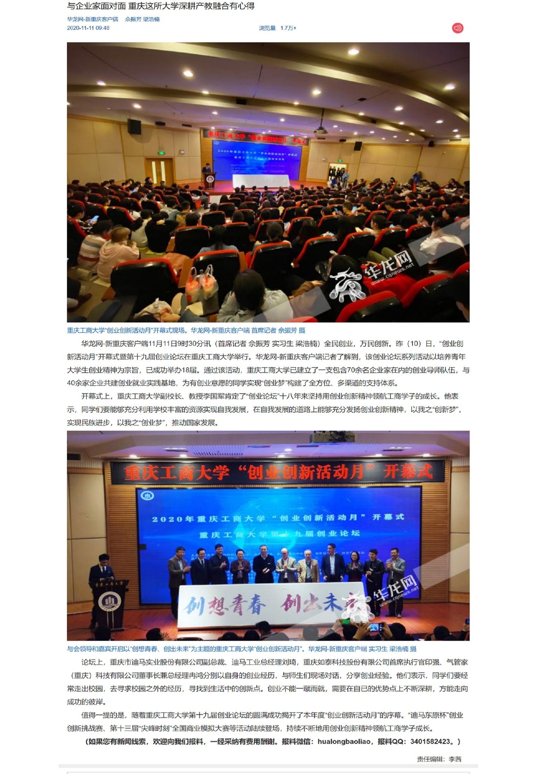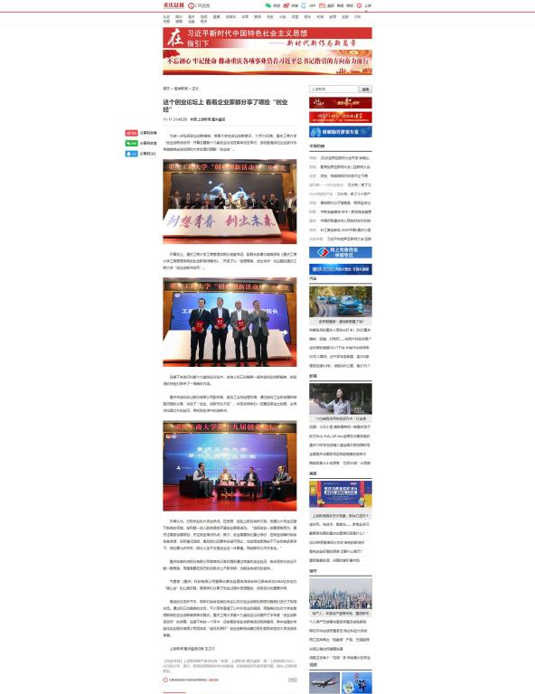 2020年11月10日晚7点,威廉希尔williamhill官网“创业创新活动月”开幕式暨第十九届创业论坛在南岸校区博智楼7200学术报告厅成功举行。重庆市迪马实业股份有限公司副总裁、迪马工业总经理刘琦,重庆如泰科技股份有限公司首席执行官印强、气管家(重庆)科技有限公司董事长兼总经理冉鸿分别以自身的创业经历,与师生们现场对话,分享创业经验。此次活动受到上游新闻、华龙网、重庆电视台等多家媒体的关注报道。