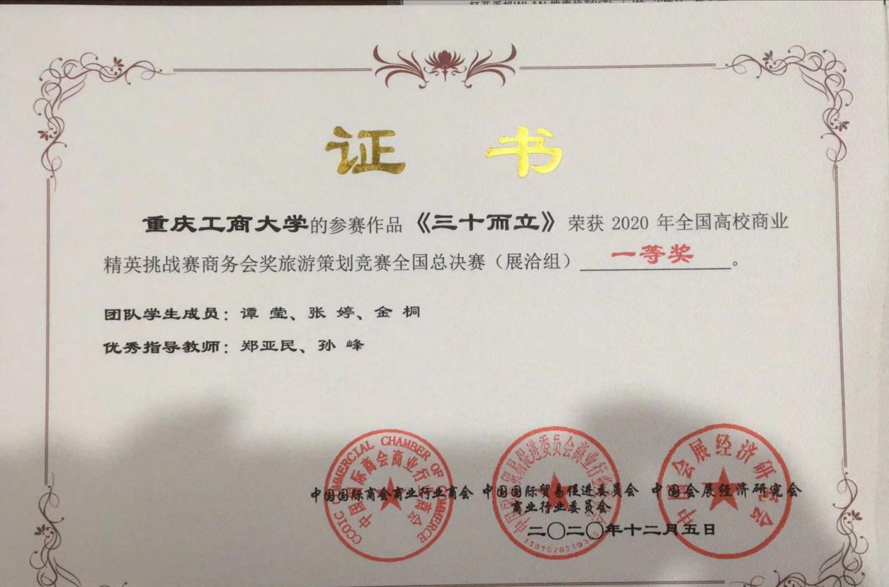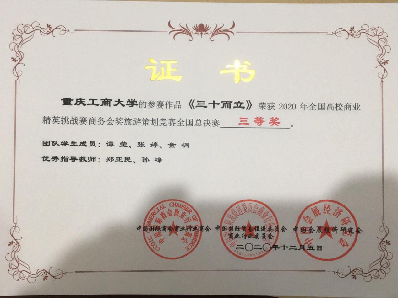 2020年12月3-5日,第十一届中国国际创意设计推广周系列活动——2020年全国高校商业精英挑战赛“颜值立方杯”创新创业竞赛和2020年全国高校商业精英挑战赛商务会奖旅游策划竞赛全国总决赛在海南省三亚市成功举办。公司由员工成员谭莹、张婷、金桐,指导老师郑亚民、孙峰组成的团队参加了本次比赛。比赛过程中,郑亚民和孙峰老师辛勤付出,各位同学努力拼搏,最终斩获佳绩。本次比赛开拓了公司师生的国际化视野,使得其在国际文化的交流、碰撞与融合中实现进步与飞跃。
