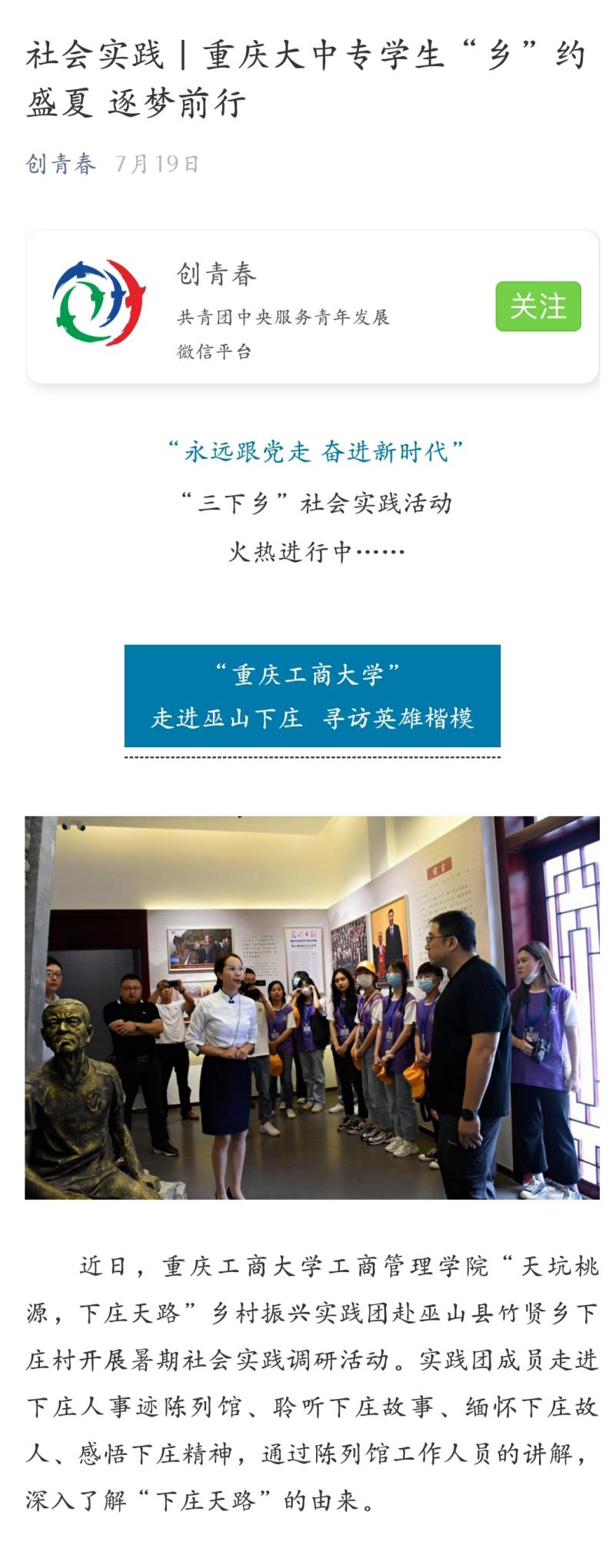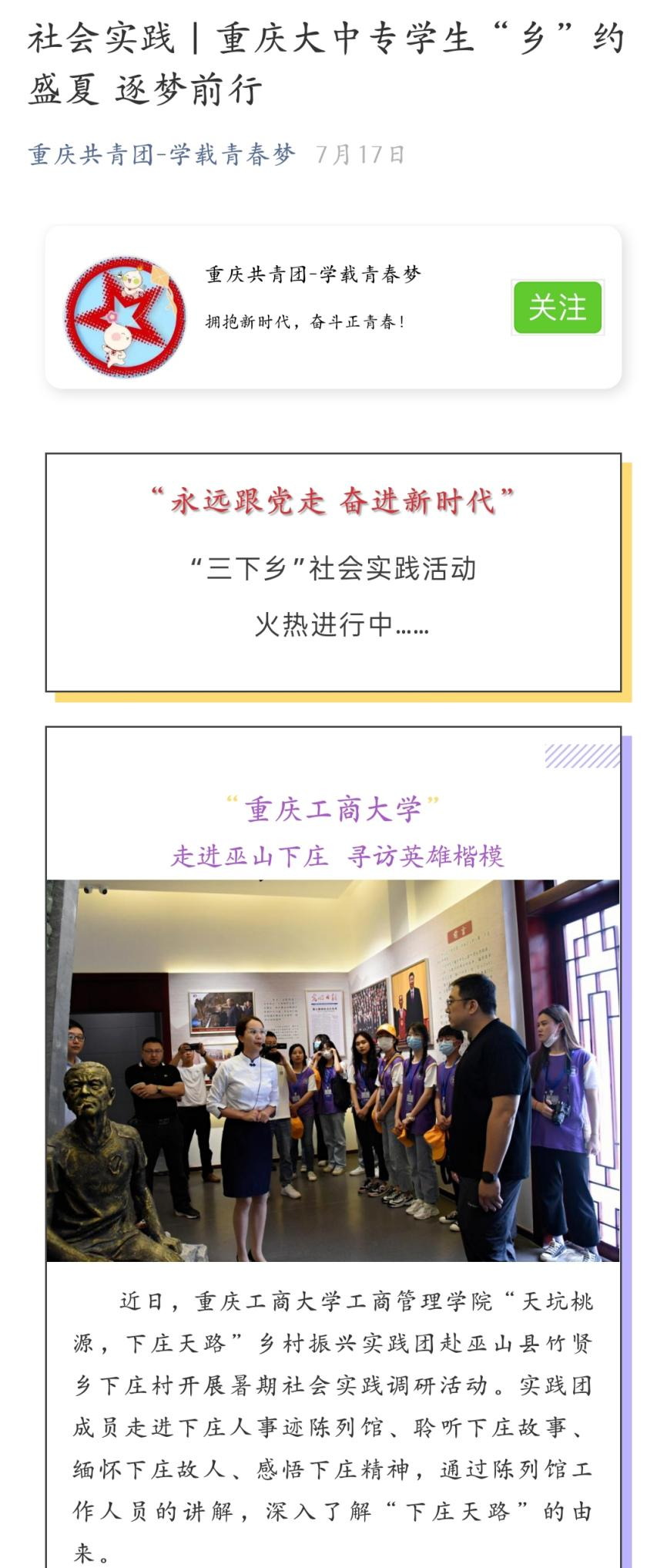 7月11日,学院“天坑桃源,下庄天路”乡村振兴实践团来到重庆市巫山县竹贤乡下庄村,邀请时代楷模、村党支部书记毛相林在愚公讲堂就“下庄天路”的故事开展了专题学习,并参观了下庄人事迹陈列馆。为了脱贫致富,毛相林支书带领村民们捐钱出力,在空中荡,壁上爬,用钢钎撬,用雷管炸,用两脚蹬的方式历时七年在绝壁上凿出一条8公里的“天路”。毛相林书记带领下庄人民不畏艰险,身先士卒,践行了共产党人为人民服务的初心。毛相林支书时而慷慨激昂,时而声音哽咽,用心、用情重述了那段难忘的历史,现场的同学们感动得热泪盈眶,同学们纷纷表示要向毛相林书记学习,在以后的工作中要扎根基层,服务人民,奉献青春。
