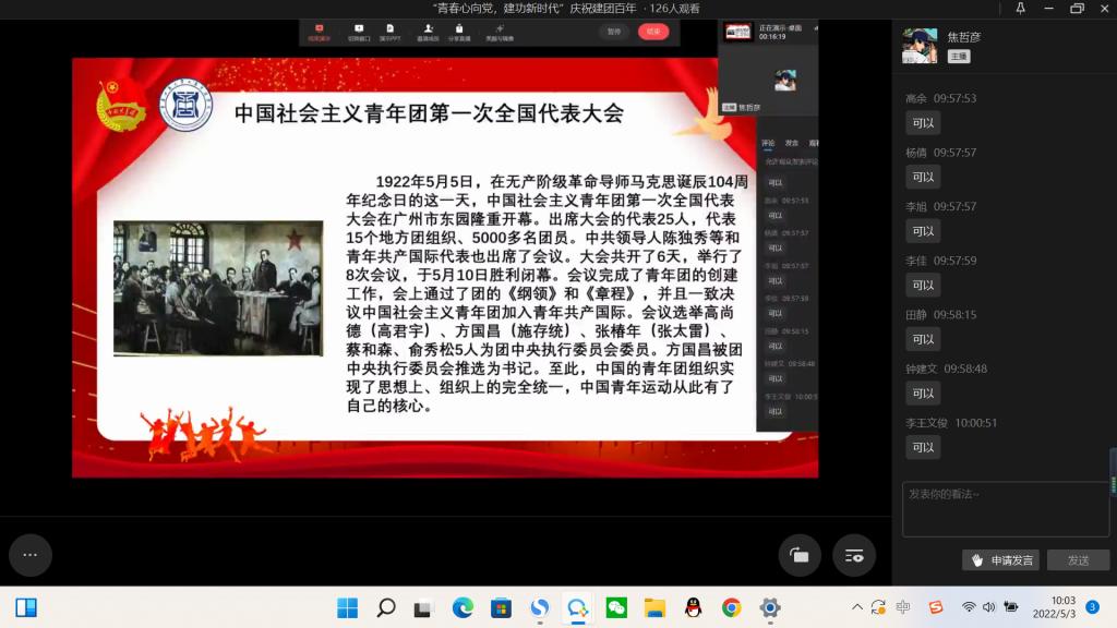活动伊始,全体与会人员齐唱团歌,而后进入活动第二项“学习团史”,经过对建团百年来的重大历史事件、历史使命的学习,与会人员发表了自己的感受并通过“团史知多少”的环节与主持人进行了积极的线上互动。最后,谭予涵对此次活动进行了总结,希望团干部们坚定理想信念,积极思考、勤奋工作,在学习、工作和生活中留下青春奋斗的鲜明印记。