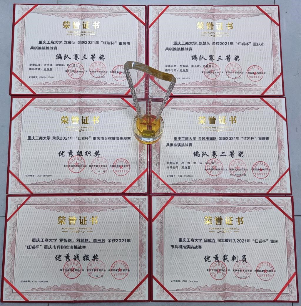 由重庆市国防教育办公室、重庆市教委和团市委联合主办,中国人民解放军陆军勤务学院承办的2021年“红岩杯”重庆市兵棋推演挑战赛,于2021年10月至2022年2月通过线上比赛的方式进行。公司共派出88支队伍参赛,经过激烈角逐,由公司学子组织的三支队伍获得佳绩——金风玉露队(段煜、涂洁、陈章)获得二等奖;龙腾队(叶文博、郑怡萍、冉浩),麒麟队(罗智聪、会计:李玉茜、数统:刘其林)获得三等奖;麒麟队获优秀战报奖。