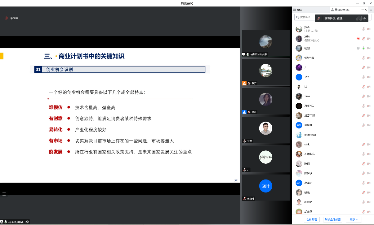 杨老师首先分享了其作为商业指导老师获得第七届“互联网+”大赛金奖的比赛经历,为员工提供了创新创业类大赛选题的参考思路。接着,杨老师结合自己担任国赛评委的经历,重点讲解了商业计划书的框架、构成、写作要点、路演等内容。通过杨老师对成功案例生动的剖析和在线同学的互动,使同学们在商业计划书的写作方面,获得了专业有效的指导,拓宽了思路,对于写作要求及要点都有了更为深入全面的了解。