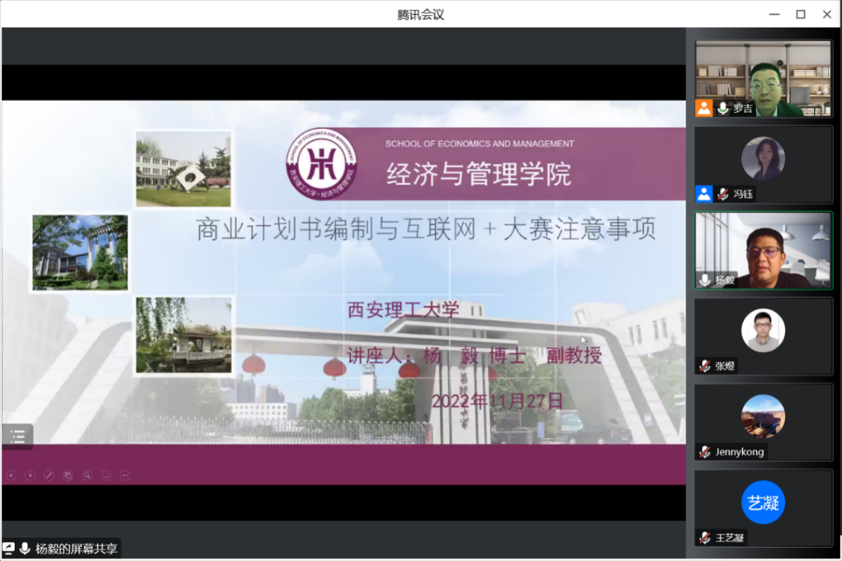 为了进一步推进公司创新创业教育,提高员工学科竞赛水平与能力。2022年11月27日,工商管理系特邀西安理工大学经济与管理学院杨毅副教授作了题为“商业计划书编制与互联网+大赛注意事项”的在线讲座,讲座由罗吉副主任主持。