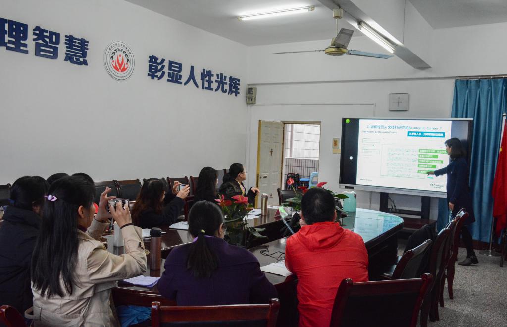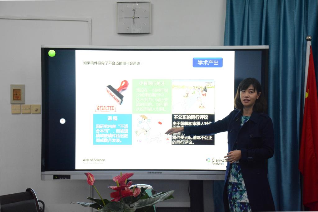 首先,黄经理向在座的老师和研究生介绍了郭杨专家,并阐明开展此次讲座目的。随即专家郭杨女士开始讲座,她以人文科学研究的国际视角向在场学者、研究生介绍到:因为社会科学研究国际化是全球化时代的必然要求,则人文科学研究需要“国际化”。紧接着她介绍了关于Web of science及引文索引的相关应用及好处,耐心地介绍了其主要内容以及操作方法。后又以类比的方法将做企业与找课题作对比,生动形象地说明了应如何经营人文社科研究。最后以如何选择将论文投到恰当的期刊,如何对经管类期刊影响力进行评价为话题为本次讲座画上了圆满的句号。